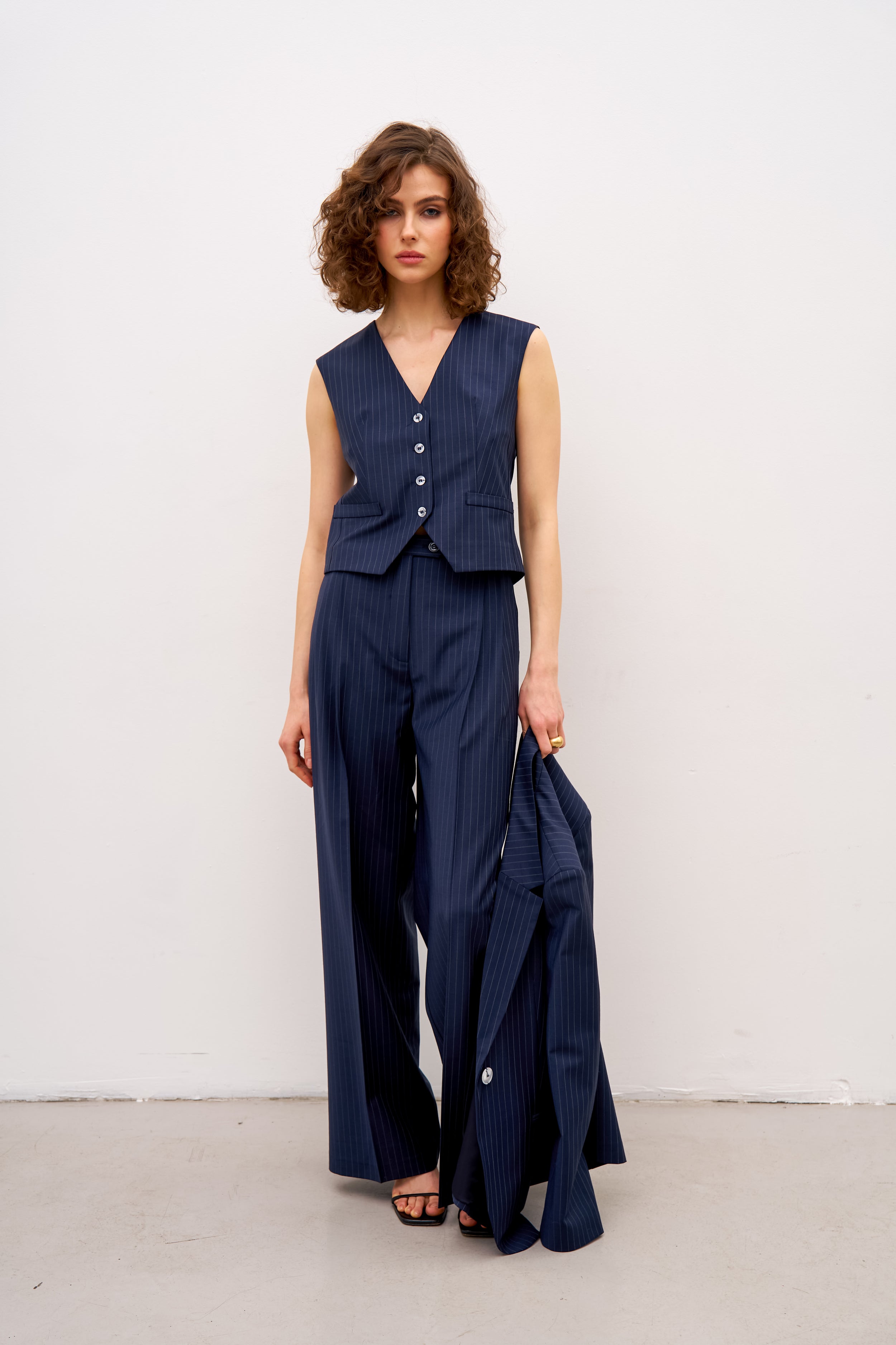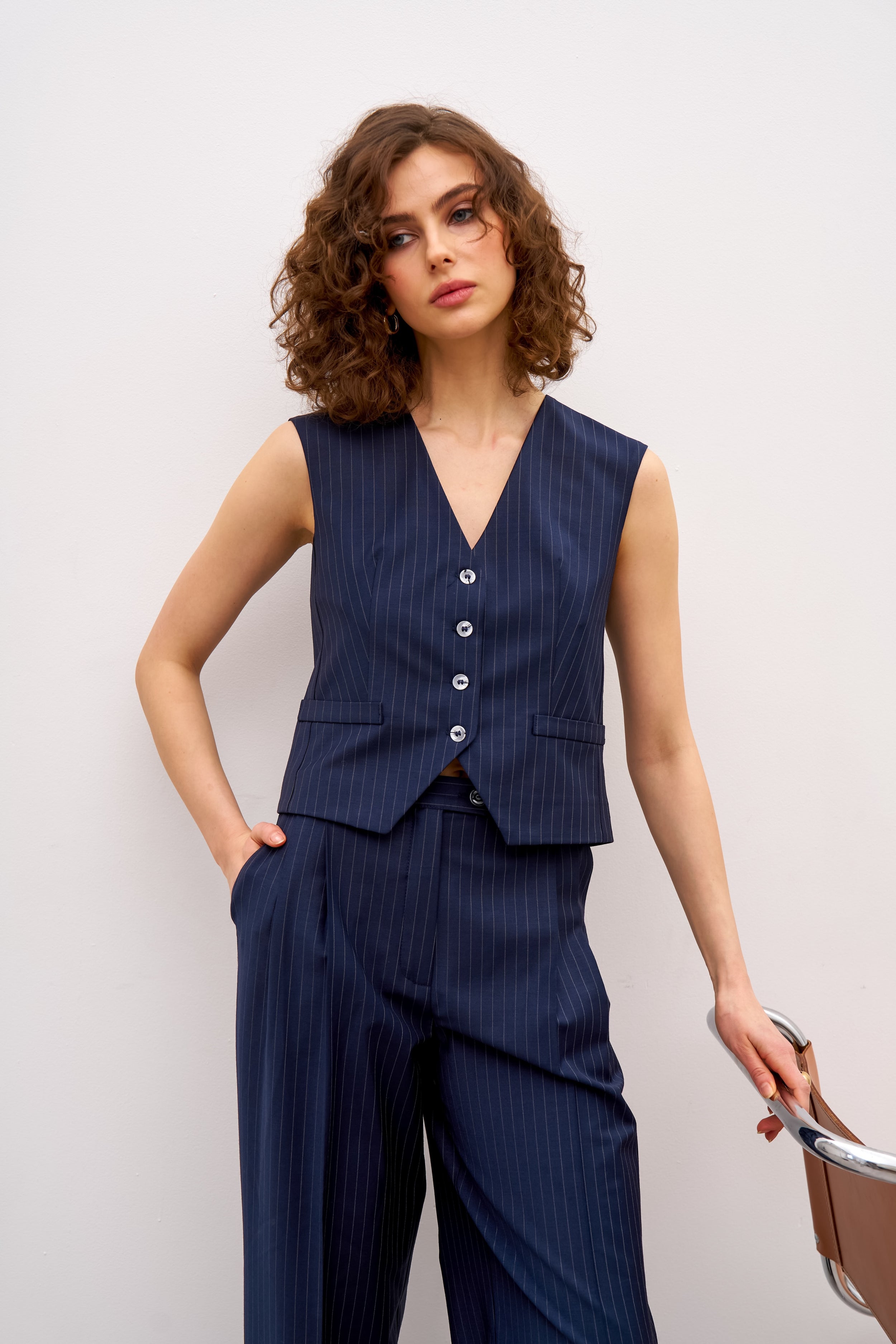 Жилет має напівприталений крій, який візуально робить фігуру стрункішою. Жилет має подвійні прорізні кишені.