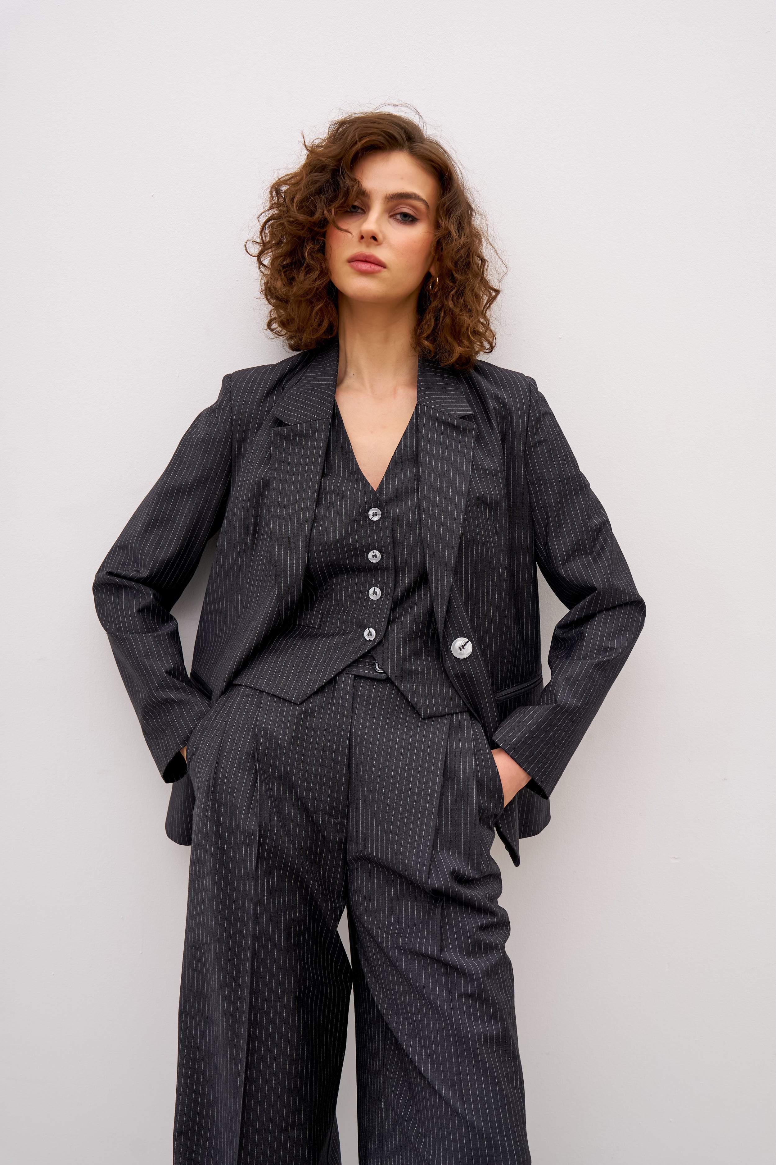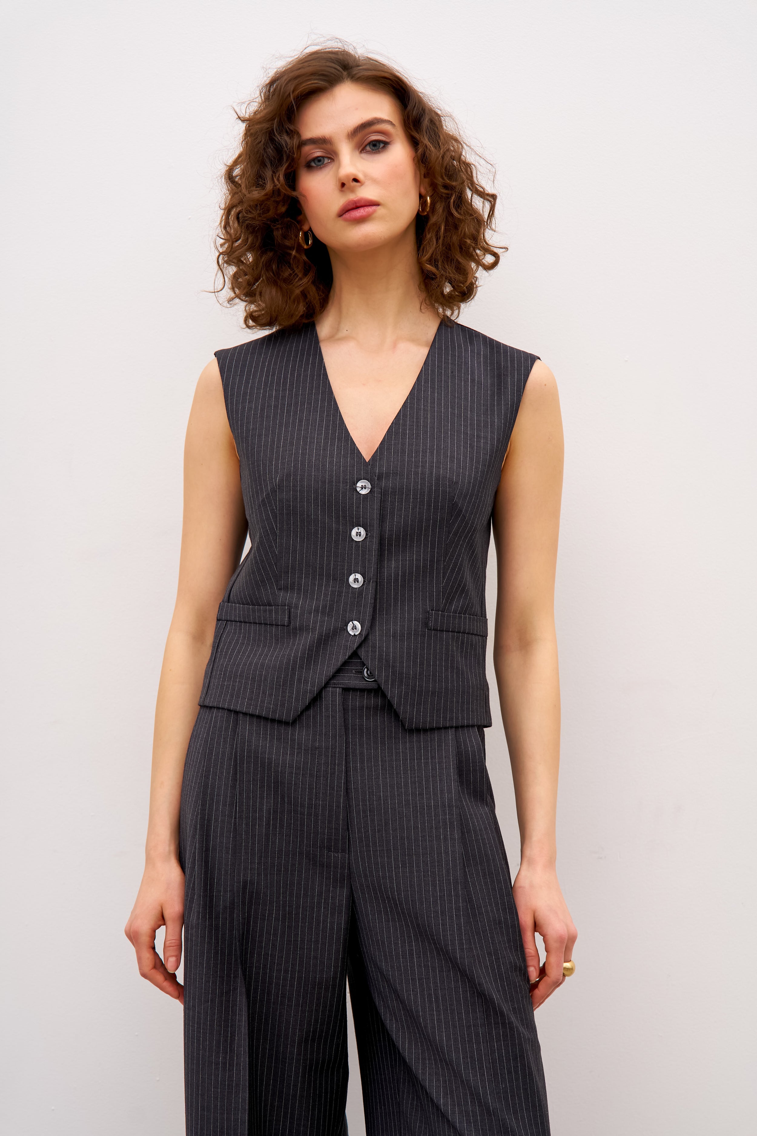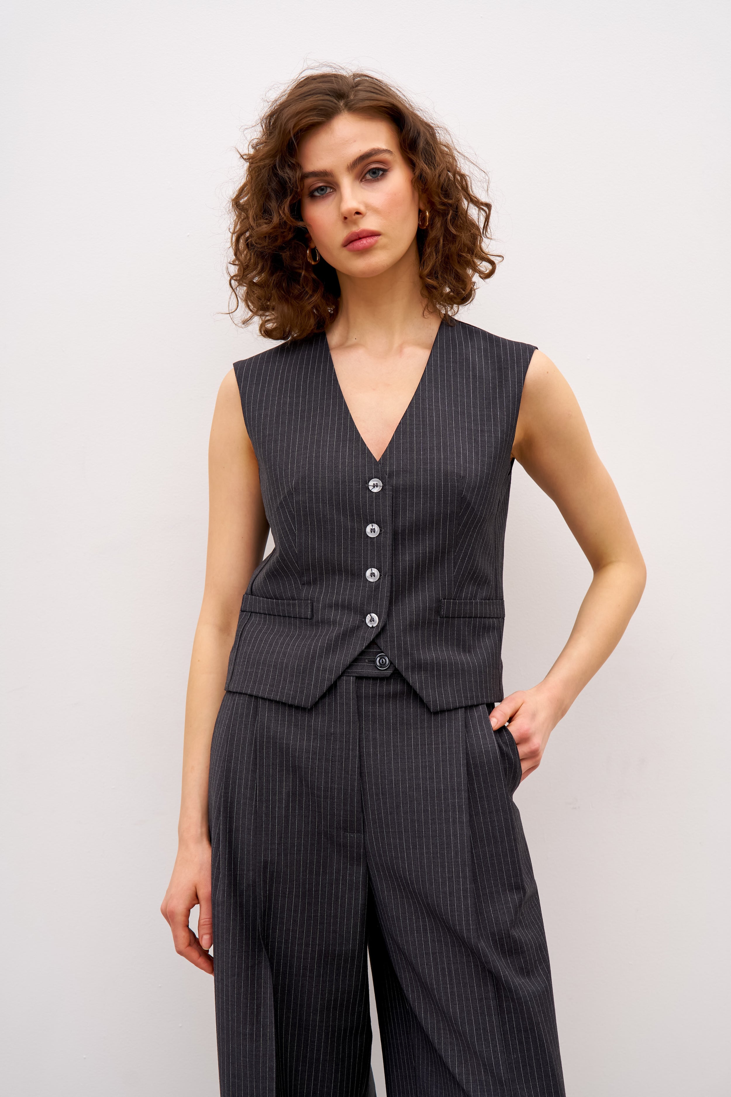 Жилет має напівприталений крій, який візуально робить фігуру стрункішою. Жилет має подвійні прорізні кишені.